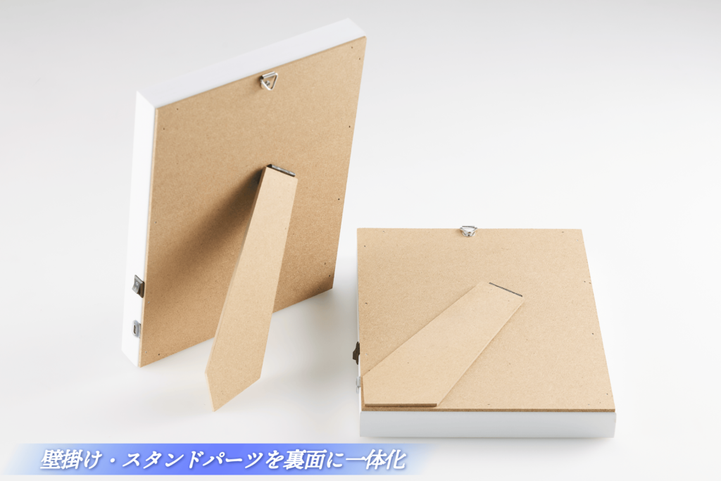 本品は、インテリアアイテムとして存分にご利用いただけるよう、キャンバス背面に壁掛け用の金具があり、画鋲やフックで簡単に壁に飾ることが可能。また、スタンドパーツも背面に備えており、机上などにスタンドスタイルで飾ることもできます。