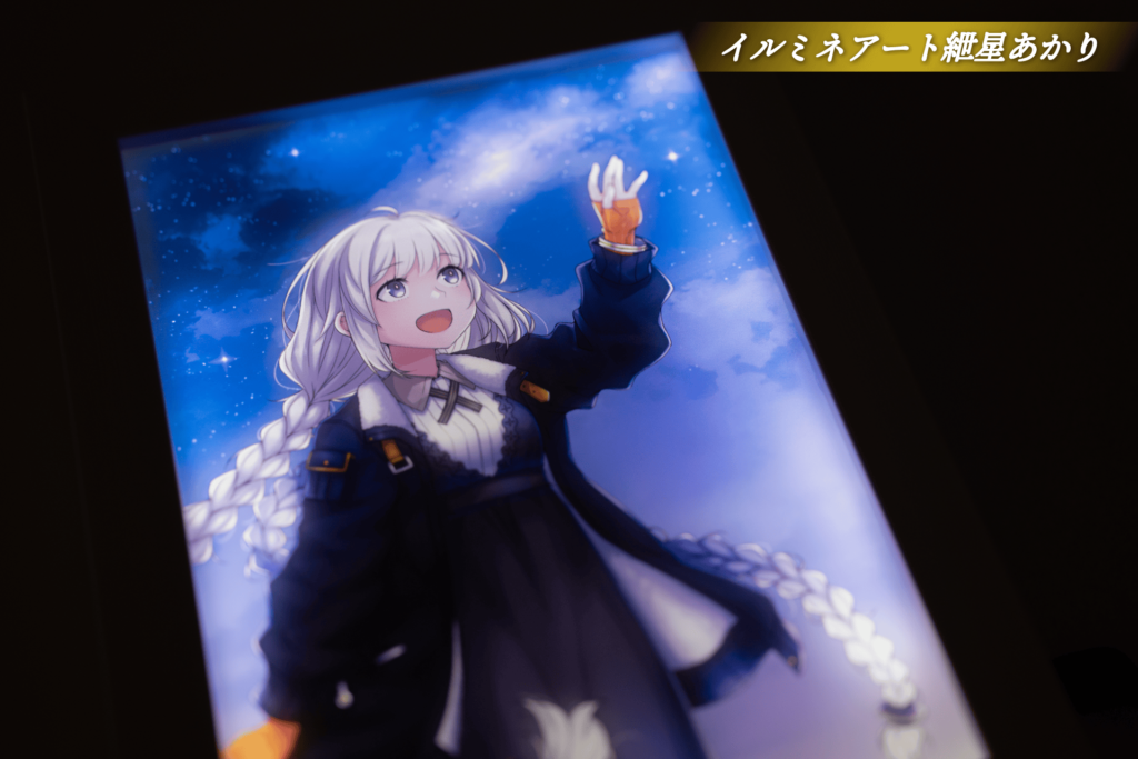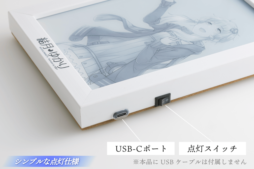ですが、普通のキャンバスとは違い、額縁側面に給電ポートとスイッチが。これをオンにすることで…イラスト本来の鮮やかな色合いにライトアップ!部屋の中に、小さなシアターができたような感覚です。