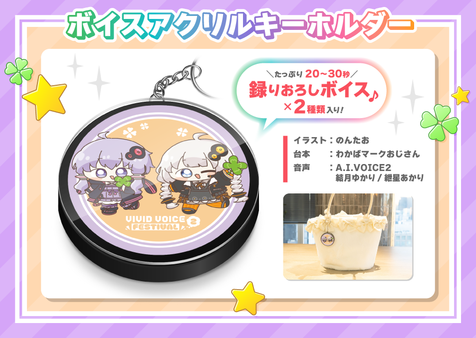 のんたおさんイラストでわかばマークおじさんさんが音声制作の「ボイスアクリルキーホルダー」、ペテン師さんイラストの「アクリルスタンド」など、いろいろ詰まった「『VIVID VOICE FESTIVAL2』開催記念福袋 結月ゆかり/紲星あかり」、お正月から期間限定販売となりますので、この機会に是非ご検討ください。