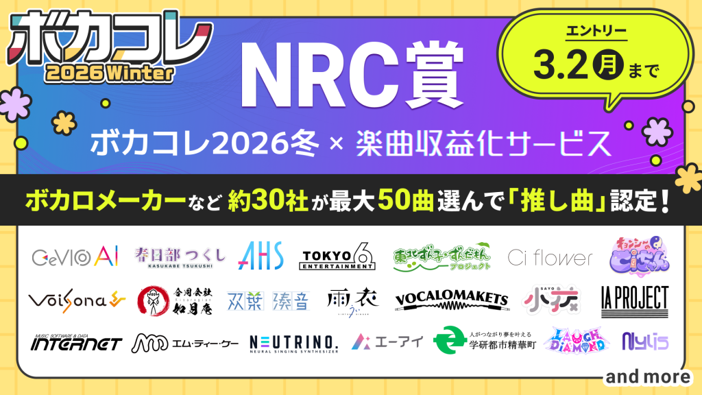 【ボカコレ2026冬 × 楽曲収益化サービス】ボカロメーカーや公式があなたの楽曲を選出&担当者がコメント!「NRC賞」と「全ほめ」を開催!(2月19日(木)~3月2日(月) 開催)|ニコニコインフォ