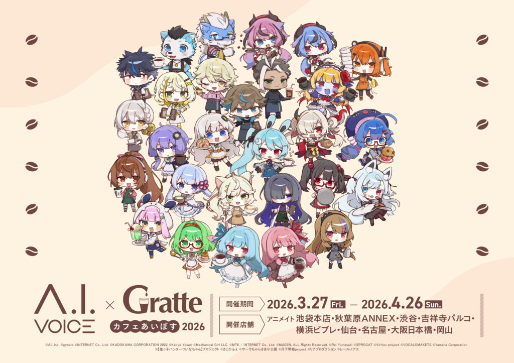 また、2026年3月27日(金)~4月26日(日)の期間で、A.I.VOICE×Gratte「カフェあいぼす2026」コラボカフェも開催いたしますのでこの機会にどうぞよろしくお願い致します。