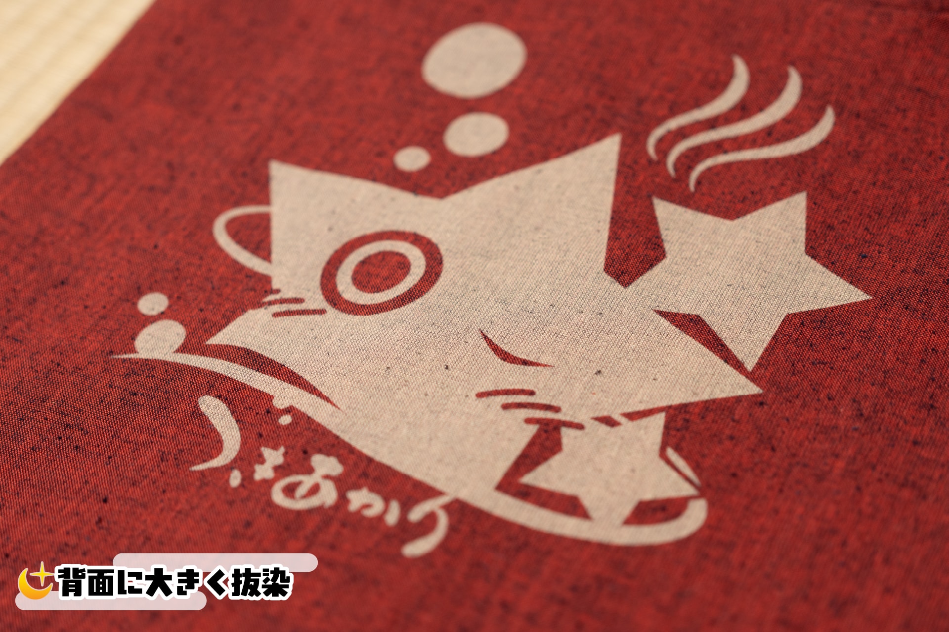 背面には紲星あかりちゃんのロゴを温泉風にした特殊ロゴを、大きく抜染(ばっせん)加工。生地から色を抜いて柄を出す加工方法で、綿本来の生成りの色でデザインが浮き出ています。