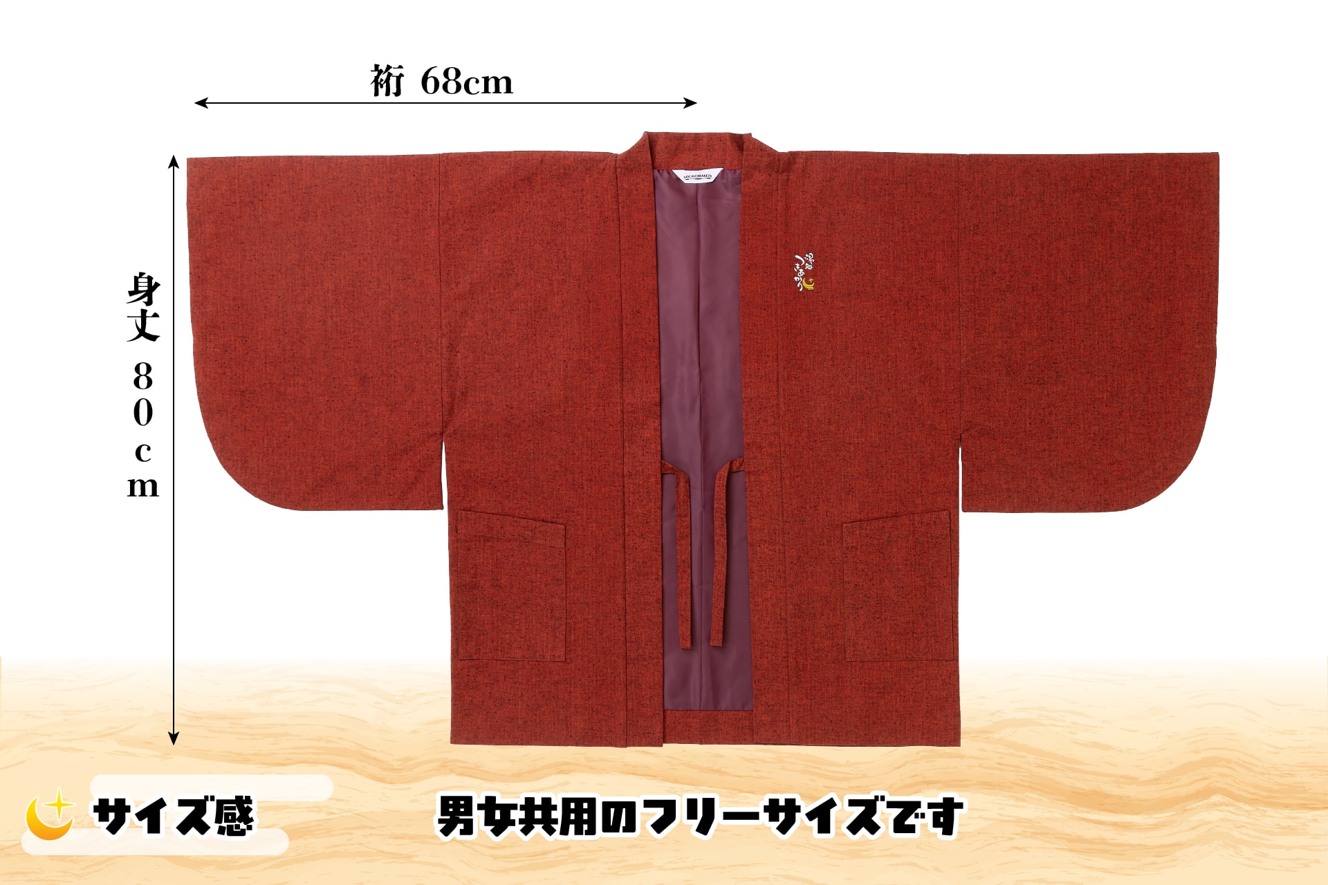 なお、本羽織は男女共用のフリーサイズ1種類となっております。身丈は80cm、裄(ゆき)は68cm。旅館に置いてある一般的な羽織と基本サイズは変わらないため、多くの皆様に過不足なくご利用いただけるものと思います。