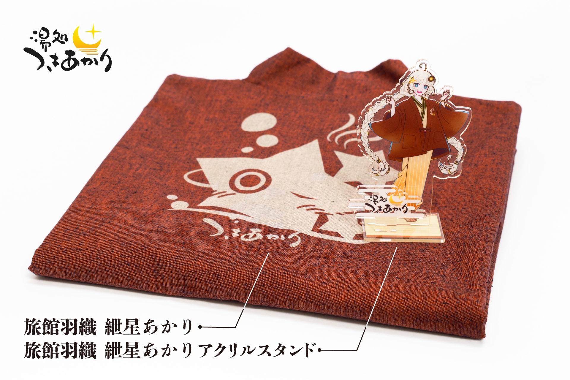 前回に引き続き、たぶん本邦のどこかにあります温泉旅館「湯処つきあかり」をテーマにした商品企画。オリジナル旅館羽織と、キービジュアルのアクリルスタンドをご用意しております。