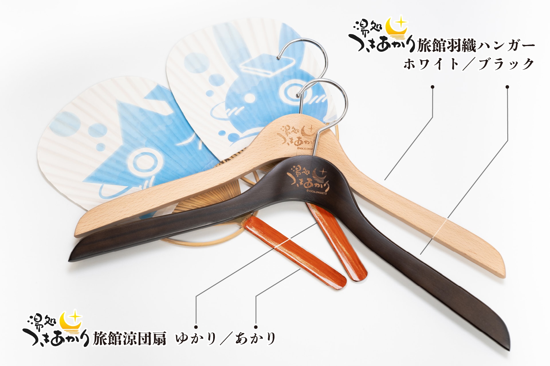 今回はこれらに加え「湯処つきあかり ハンガー」二種と、「湯処つきあかり うちわ」二種をご用意しました。ハンガーは予約限定、お財布に余裕のある方は是非羽織と一緒にご検討ください。