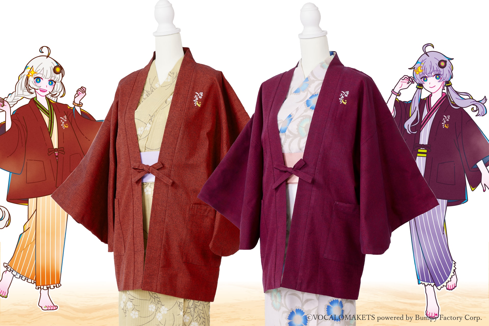結月ゆかりさん(25/9/30の記事リンク設定)に続き、紲星あかりちゃんデザインの温泉旅館羽織が求められていたため、これを企画・開発致しました。羽織は九州も筑後の特産品である「久留米織」製の国産品。生地選定から形状検討まで独自規格で開発致しました。あかりちゃんも羽織ってください。