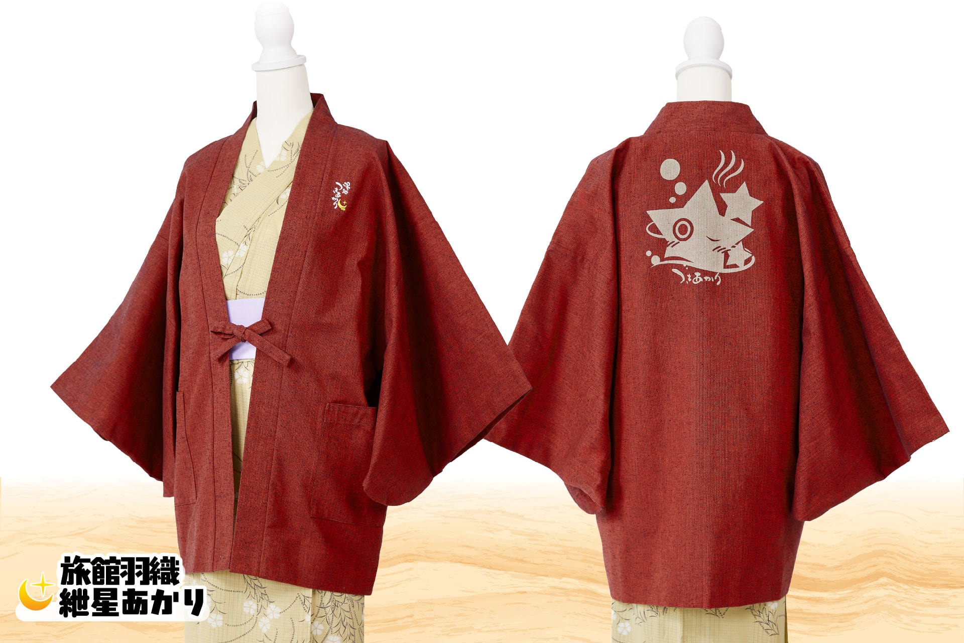 この手のキャラグッズとしては、ライブイベントなどで販売されるプリント法被がメジャーかと思いますが、本羽織は後述の通りガチで旅館に給される品質水準の国産羽織となっております。温泉旅館コンセプトではありますが、室内着として普段使いのできる羽織としてご利用ください!
