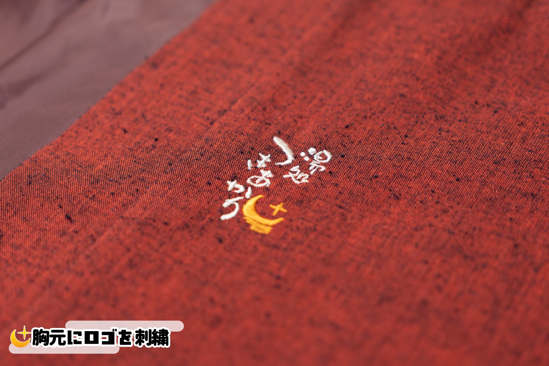 胸元には「湯処つきあかり」のロゴを刺繍。温泉旅館備えつけのアイテム感がグンと高まりました。時折なでなでして嬉しくなりましょう。
