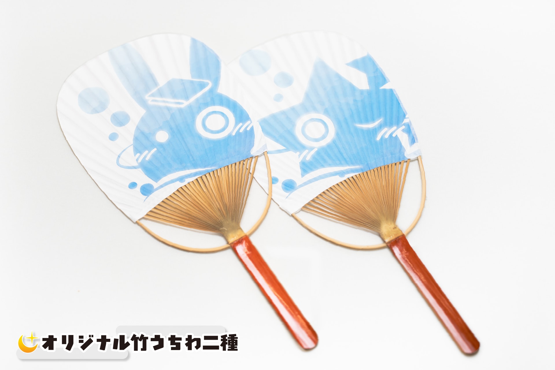 「湯処つきあかり 旅館涼団扇」は旅館羽織に用いた温泉ロゴをデザインした竹製団扇です。ゆかりさん・あかりちゃんデザインの2種類あり、各1,000円/枚・税込。
